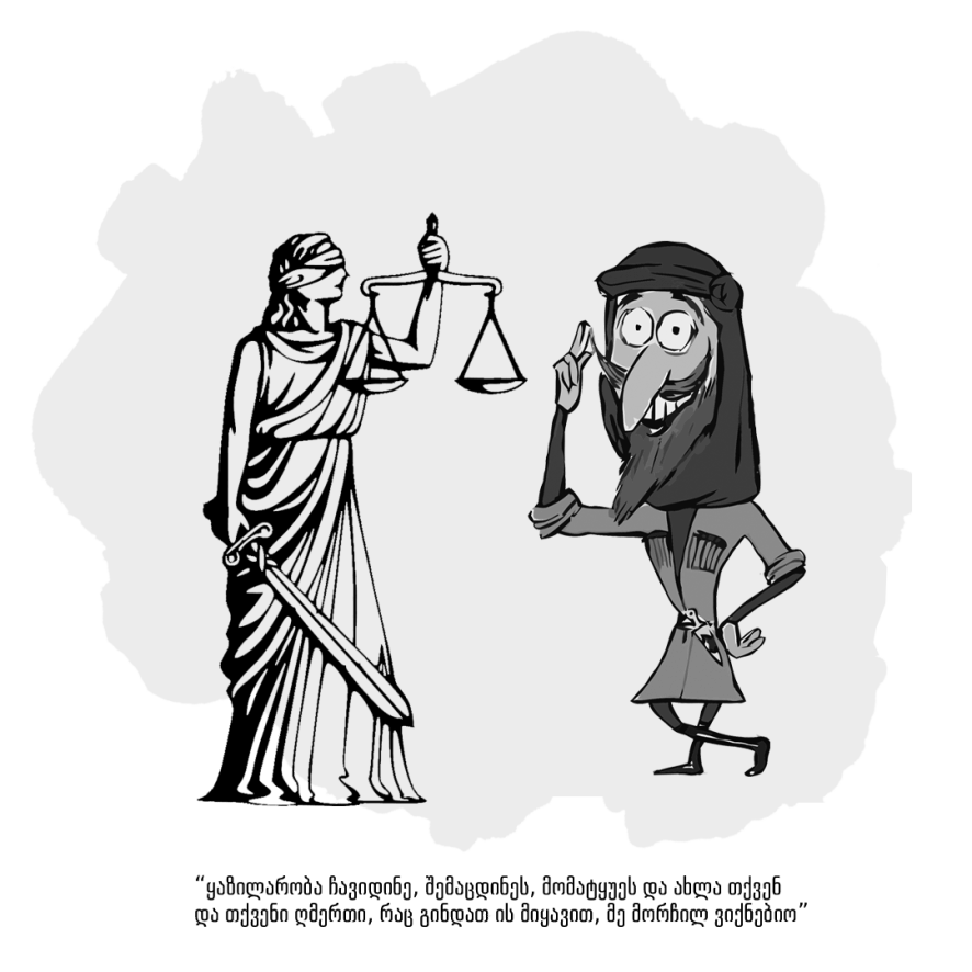 შეკრების აზრი იყო მხოლოდ ის, რომ ქურდები გაესამართლებინათ, კრება დაიწყო, თავმდჯომარე კითხულობს იმ ქურდების სახელსა და გვარს, ვისი საწმეც უნდა გაირჩეს, სულ ხუთია, ჰბრალდებათ გაძარცვა ოზურგეთ-ნატანებს შუა დელეჟნებ - ეტლებისა. კომისიის წევრნი, რომელნიც არჩეულნი იყვნენ ხუთის სხვა და სხვა საზოგადოებისაგან, ლაპარაკობენ რიგ-რიგად და ამტკიცებენ, რომ ბრალდებულნი ნამდვილად დანაშაულნი არიან, ამას ვამტკიცებთ დიდძალ მოწმეების ჩვენებით საზოგადოებიდან, დაკარგული ნივთების მაგათ ხელში აღმოჩენით და აგრეთვე ვამბობთ, რომ ორი მათგანი გამოტყდა და ყველაფერი გვიამბოო.